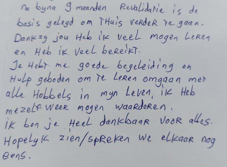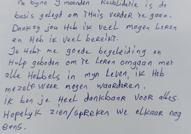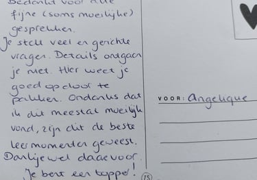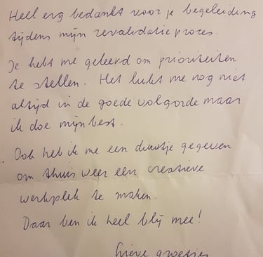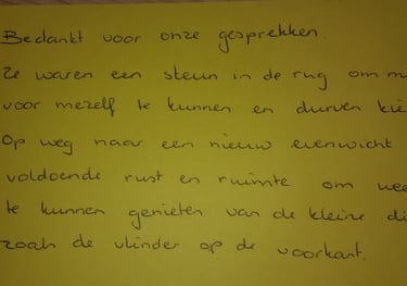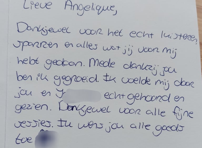 Gedurende de sessies heb ik me gelijkwaardig gevoeld. Je hebt afstemming gezocht, uitleg gegeven waarom je dingen doet, toestemming gevraagd en mij steeds betrokken en gevolgd.