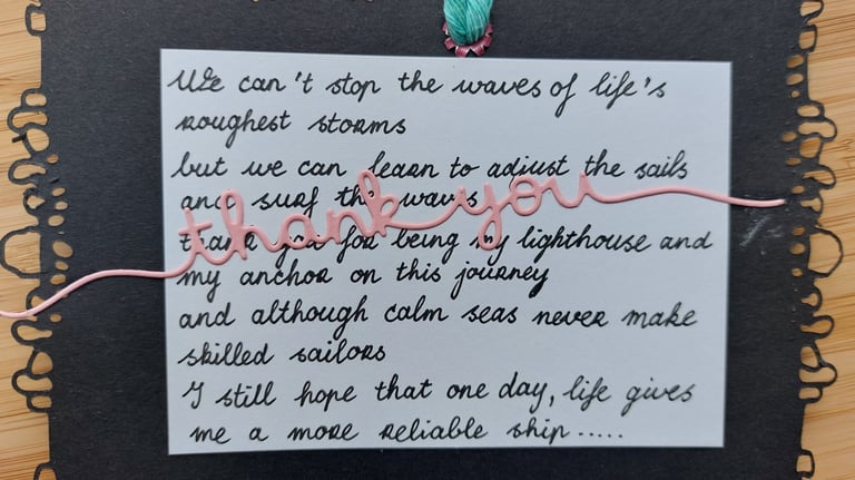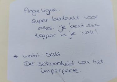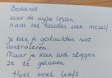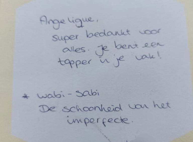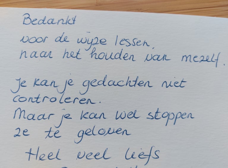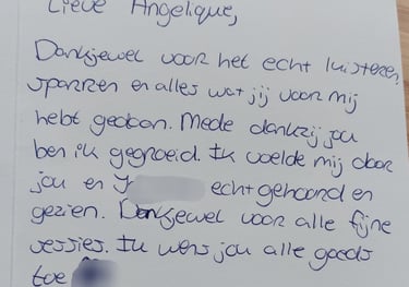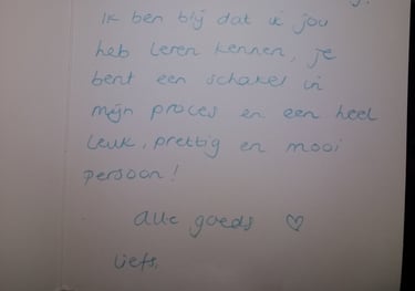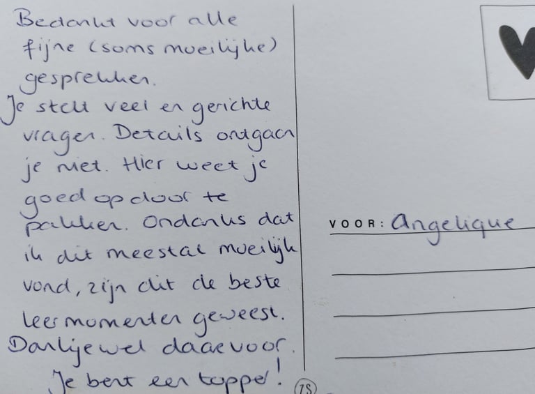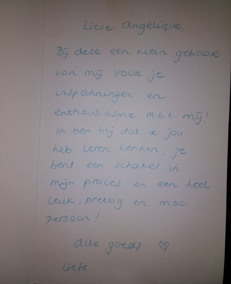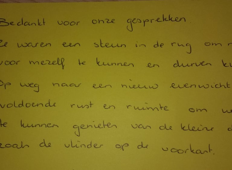 Ontzettend bedankt voor al je hulp! Ik ben je ongelooflijk dankbaar voor al het luisteren, je eerlijke en directe reacties en het fijne gevoel dat je me hebt gegeven...